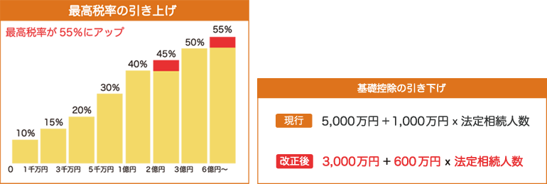 最高税率の引き上げだけでなく基礎控除(非課税枠)が少なくなるため、最高税率が適用されない人でも税金が多くなります。相続税がかかる人は、税制改正により税金がさらに増える可能性があります。